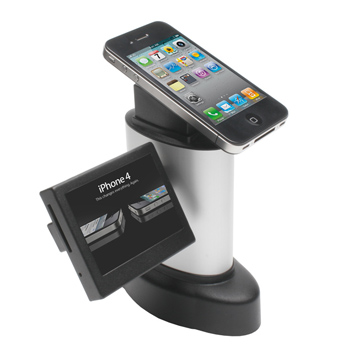 Thiết bị chống trộm trưng bày iphone, máy tính bảng, ipad có màn hình hiển thị thông tin.